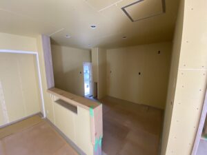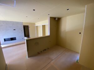 工事の流れですが、まず内部の造作、ボード張りの大工工事が完了しました。