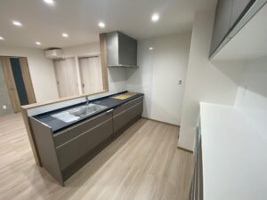 キッチンの色調はグレーをベースに部屋全体の白とマッチングしておしゃれに仕上がりました。カップボードとのコーディネートもできました。