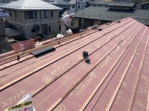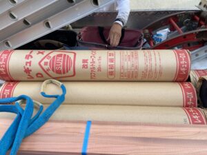まずは下葺きの作業を行います。この下葺きは、瓦からの雨漏れを2重に守るために下に敷くシート材のことで、一般的にはアスファルト系の専用材を使います。