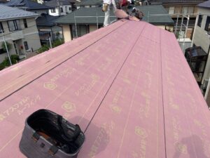 これを、屋根の軒先(水下側)から敷いていき、棟(水上)に向かって継部は10センチ以上重ねて敷きます。