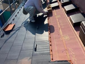 瓦を並べて固定していきます。建築基準法が改正され現在では全ての瓦に釘またわネジで固定していきます。