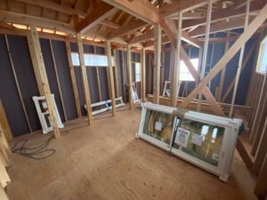 サッシ取付後、防水シートを張り専用のテープで継目を塞いで外壁廻りの工事が完了しました。これで、建築中の悪天候にも安心です。